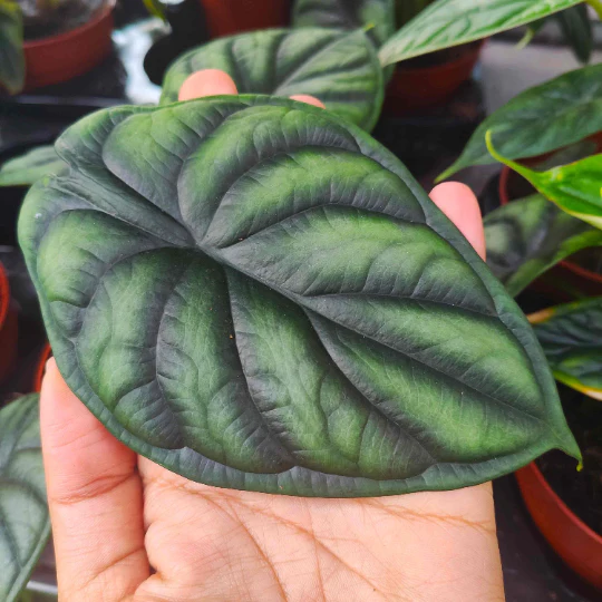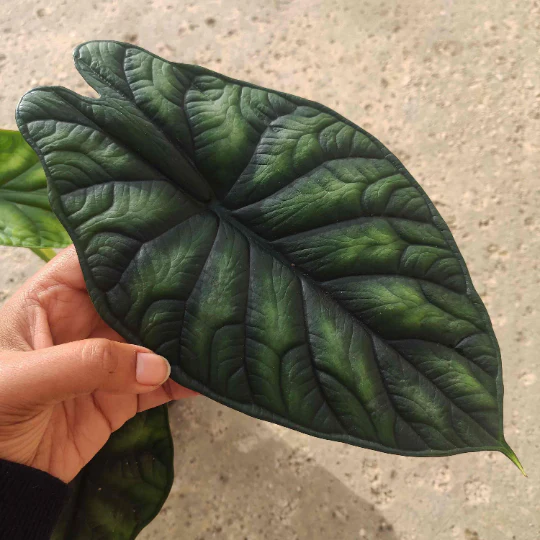 Une bouture de cette alocasia mythique dont les feuilles épaisses présentent une texture d’écailles rappelant la peau d’un dragon.